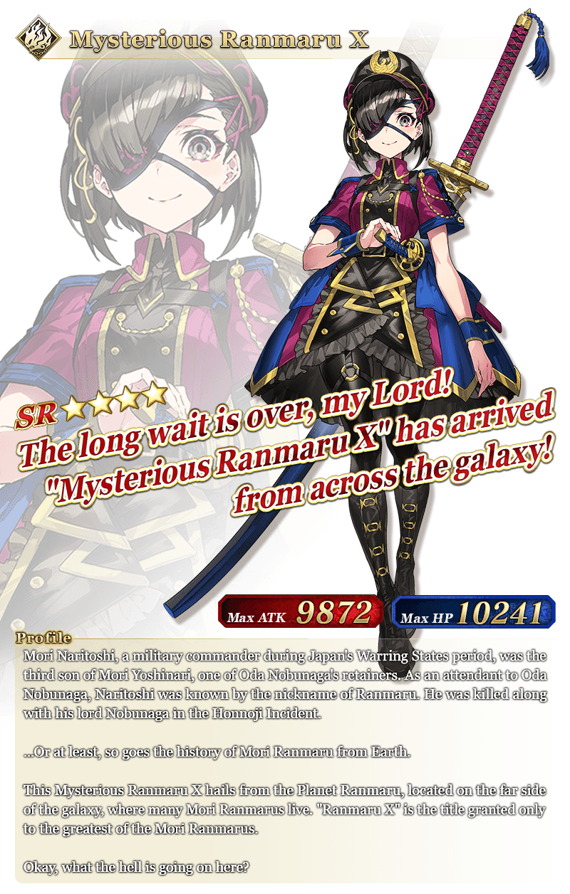 See “★4 (SR) Mysterious Ranmaru X” in action on YouTube, where we're sharing an exclusive video of their Noble Phantasm!