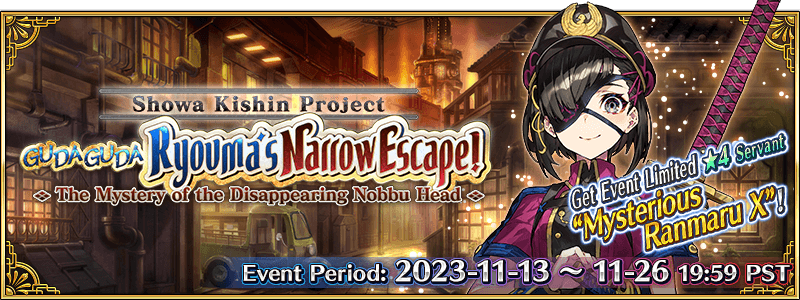The following are also ongoing for a limited time: - Showa Kishin Project: GUDAGUDA Ryouma's Narrow Escape! The Mystery of the Disappearing Nobbu Head - GUDAGUDA Ryouma's Narrow Escape! Pickup 2 Summon For more information, please see the articles linked below.
