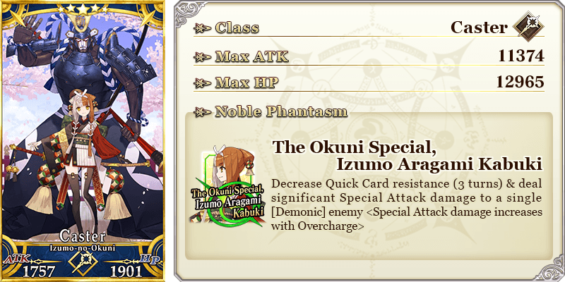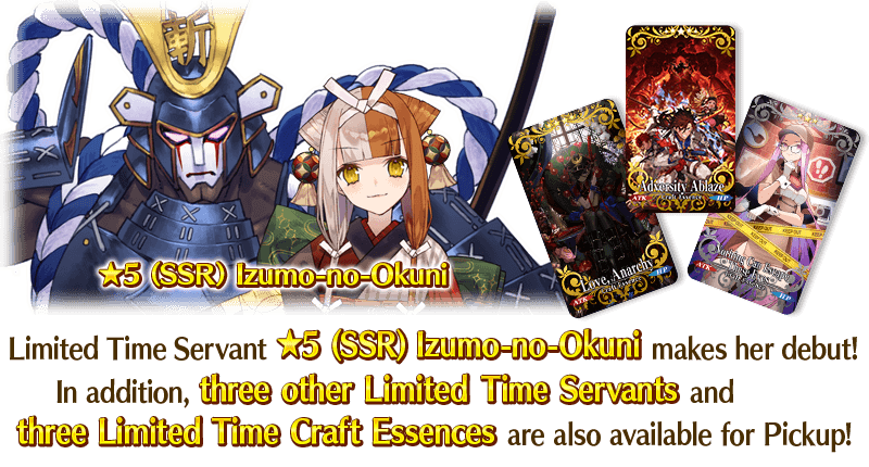 About Featured Servants: * The following Servant(s) will not be added to Story Summon after the Pickup Summon period ends. - ★5 (SSR) Izumo-no-Okuni - ★4 (SR) Oda Nobunaga (Berserker) - ★3 (R) Okada Izo - ★3 (R) Mori Nagayoshi * Please note that the following Servant(s) will not be available through Friend Point Summon. - ★3 (R) Okada Izo - ★3 (R) Mori Nagayoshi