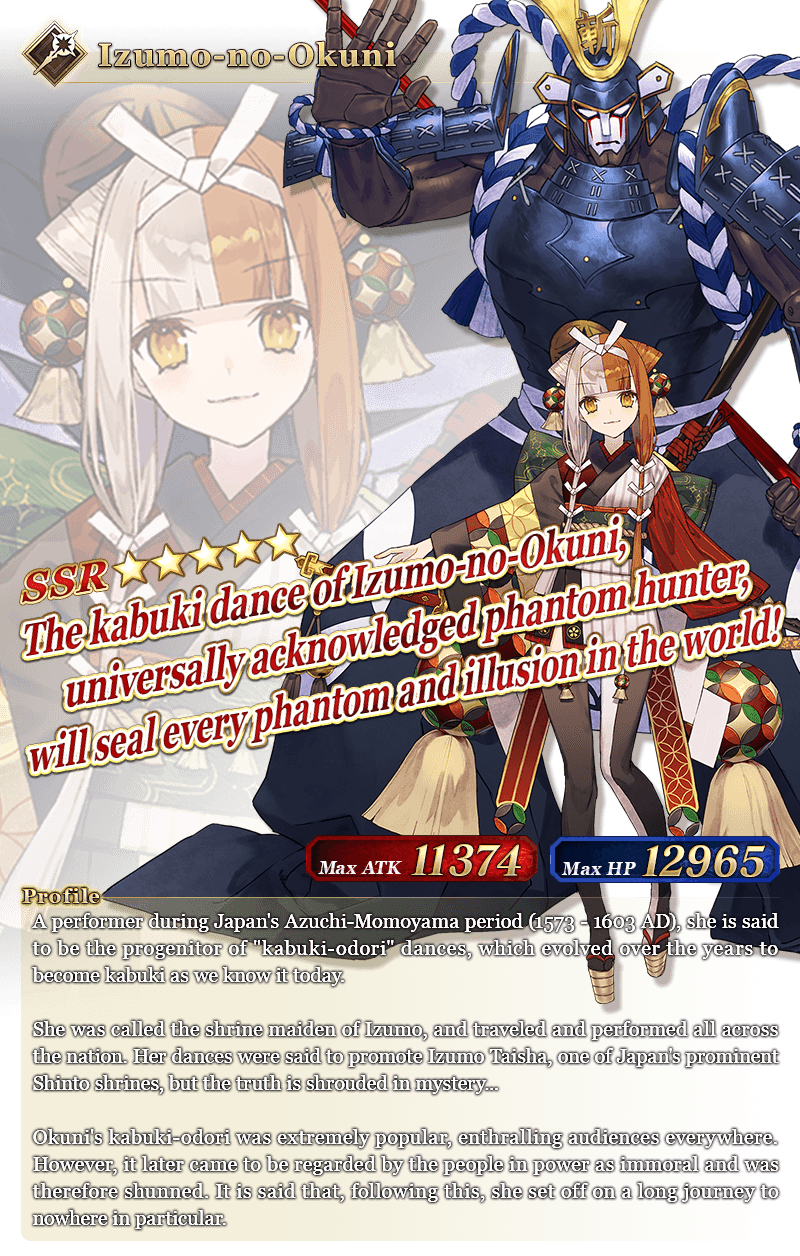 See "★5 (SSR) Izumo-no-Okuni" in action on YouTube, where we're sharing an exclusive video of her Noble Phantasm!