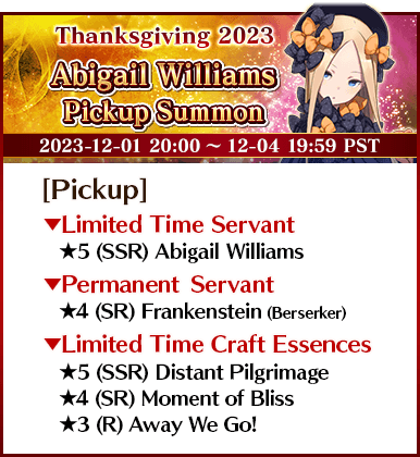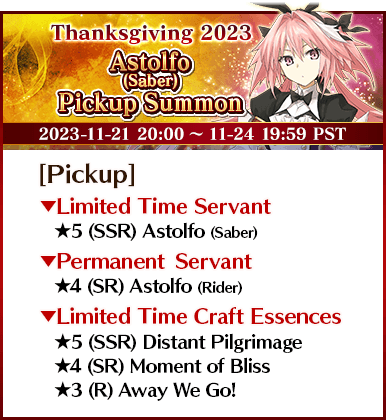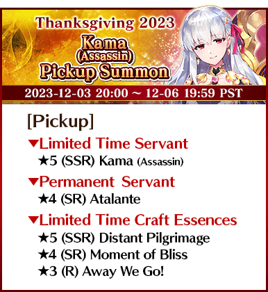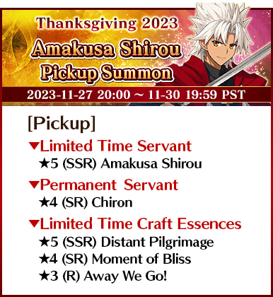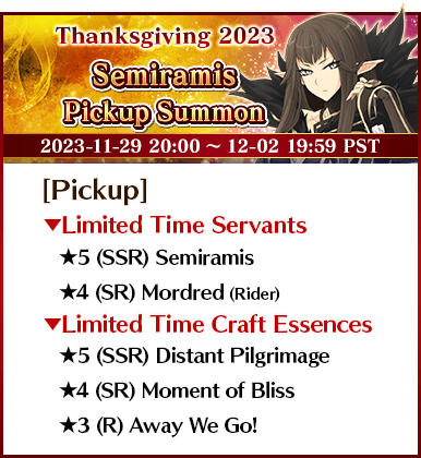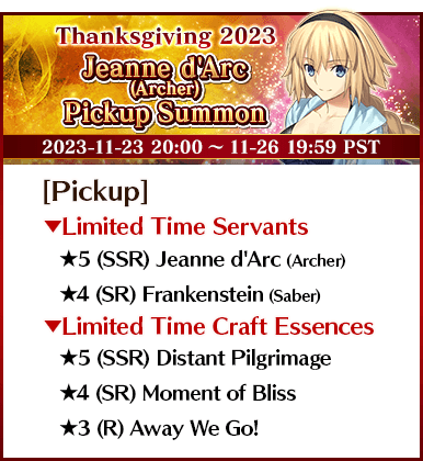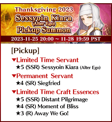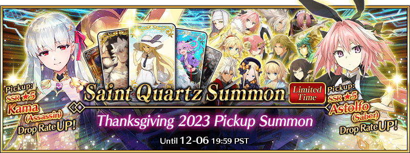 To celebrate "The FGO Thanksgiving Special 2023", 14 Servants, including nine Limited Time Servants, and three Limited Time Craft Essences will be available for Pickup in seven Pickup Summons!