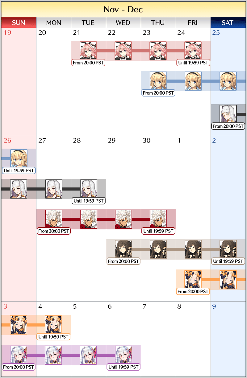 * Bonus Summons will be calculated separately for each Summon Lineup. * Please note that the Summon Period for each Pickup Summon will differ. * In this Summon, only the Pickup ★5 (SSR) Servant in each individual Summon will be eligible for the "Guaranteed Summon" feature.
