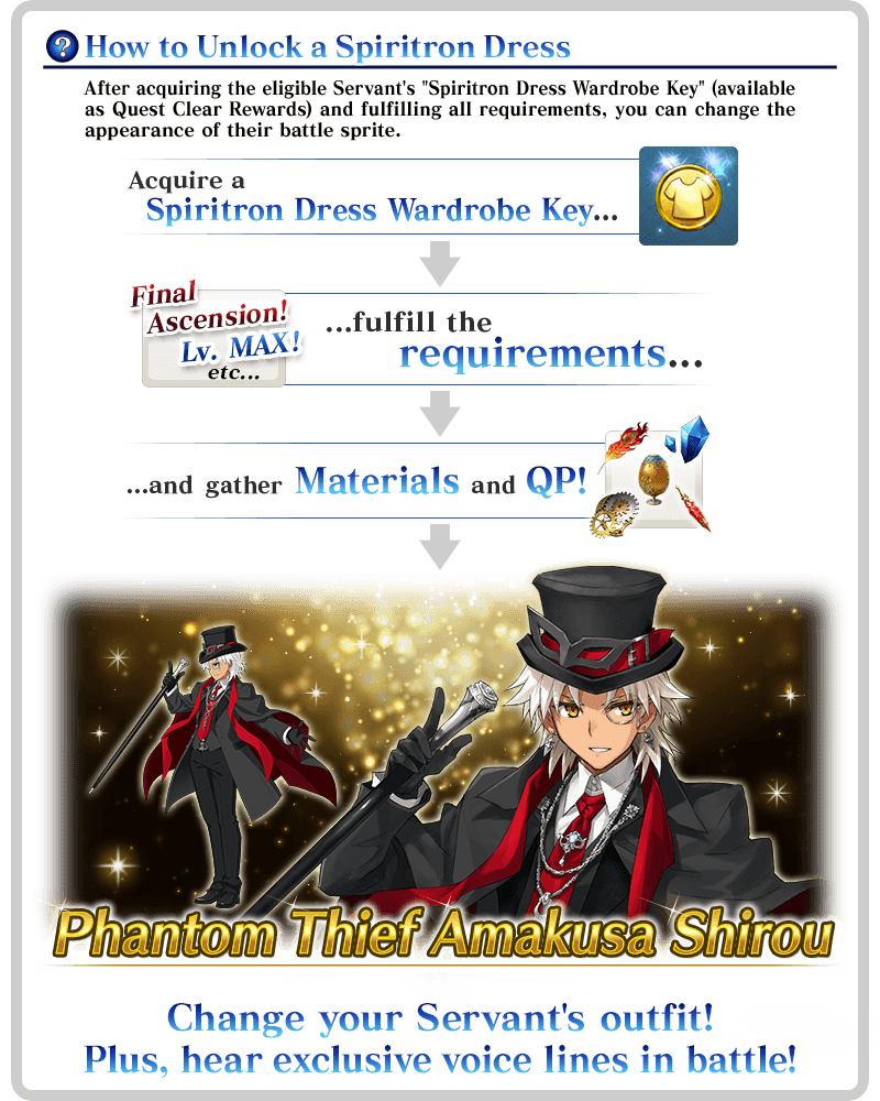 - Have not previously claimed the Spiritron Dress "Phantom Thief Amakusa Shirou" Wardrobe Key