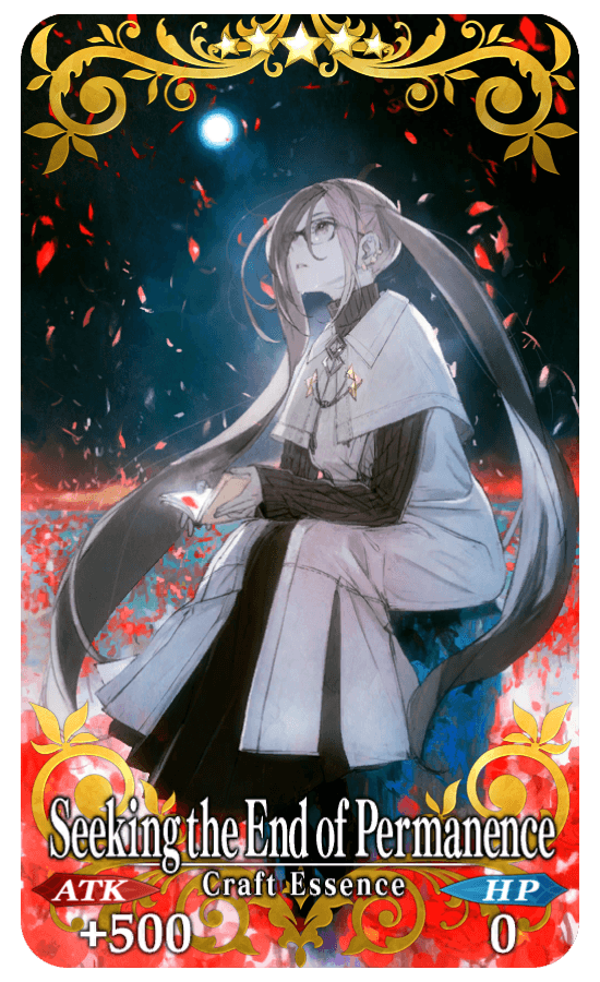 ★★★★★SSR Seeking the End of Permanence ATK 500 (MAX: 2000) HP 0 Skill Gain +5 Friend Points when used as Support (Stackable) & increase Master EXP gained when completing a quest by 1% Max Limit Break: Gain +25 Friend Points when used as Support (Stackable) & increase Master EXP gained when completing a quest by 5% |
