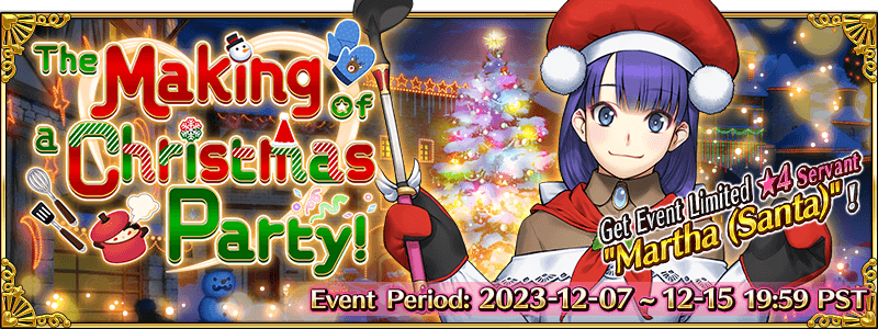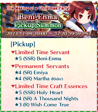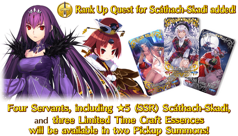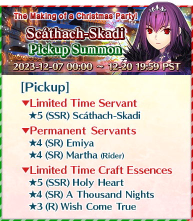 Four Servants from the Limited Time Event "The Making of a Christmas Party!", including "★5 (SSR) Scáthach-Skadi", and three Limited Time Craft Essences will be available for Pickup in two Pickup Summons!