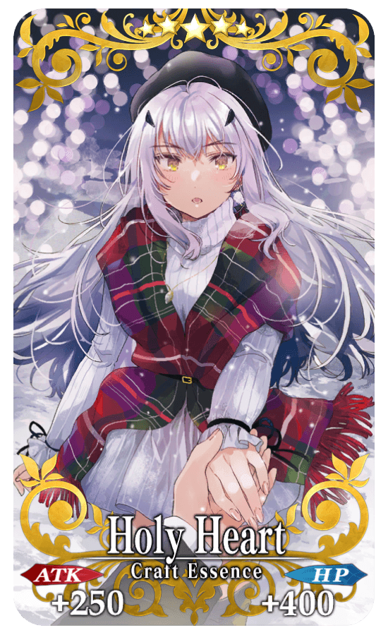 ★★★★★SSR Holy Heart ATK 250 (MAX: 1000) HP 400 (MAX: 1600) Skill Increase Arts Card effectiveness by 8% & Critical Strength by 10% & increase NP Charge by 2 levels when using NP (1 time) for yourself + Increase Rich Butter amount per drop by 1 [Event Only]