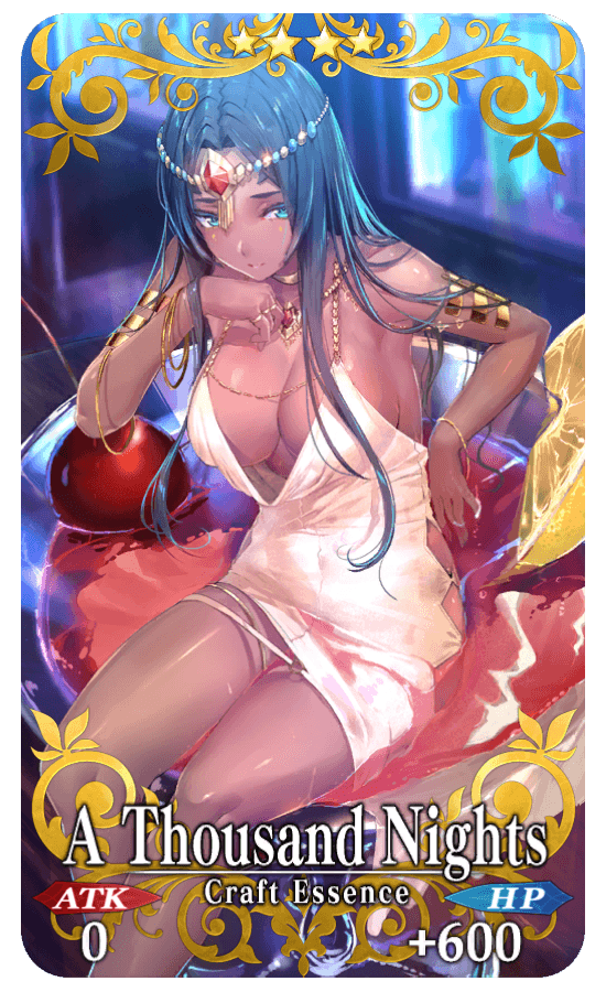 ★★★★SR A Thousand Nights ATK 0 HP 600 (MAX: 2250) Skill Increase NP Gauge by 3% each turn & Arts Card effectiveness by 3% & NP Strength by 10% for yourself + Increase Sweet Egg amount per drop by 1 [Event Only]