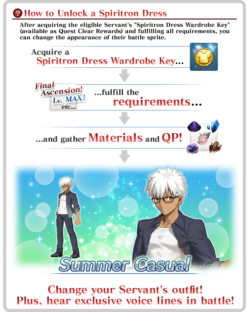* Upon unlocking a Spiritron Dress, the Servant's battle sprite and icons will automatically be changed. You can revert back to the original appearance or change to a different Ascension level from the Servant Details screen. * "Unlock Wardrobe" will only change the eligible Servant's appearance. Their class and all other parameters will remain the same.