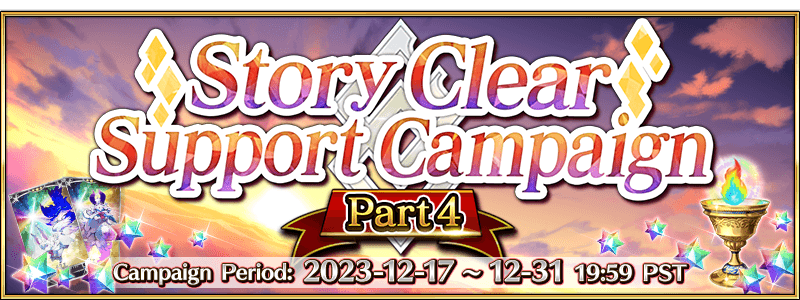 * Please note that the Mission Period and Rewards Claimable Period will differ. * This mission is separate from the weekly Master Missions that are updated every Sunday at 16:00 PST (GMT -8). If you do not claim the rewards by the end of the Rewards Claimable Period listed above, they will no longer be available. * The "[Story Clear Support Campaign: Part 4] Mission" will not be counted towards weekly Master Mission progress. * The mission will be automatically completed if you have already cleared Main Quest Part 2 Chapter 6. * You may not be able to complete the "[Story Clear Support Campaign: Part 4] Mission" depending on your Main Story progress.