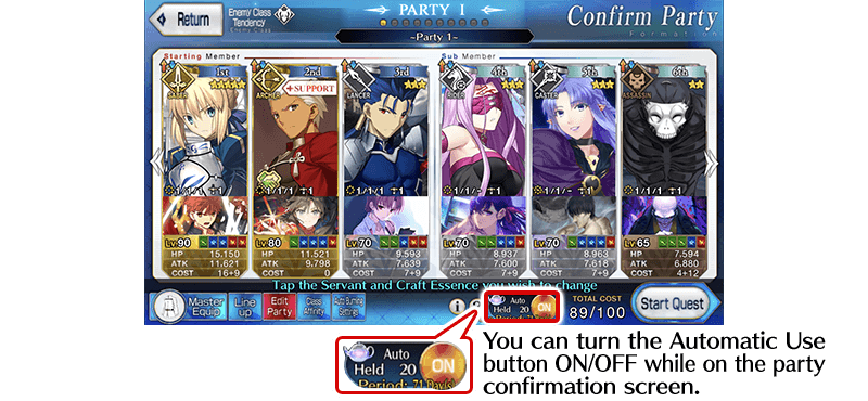 * When using a Stargazer's Teapot, the number of Bond Points earned will be the the sum of the normal amount gained for clearing the quest, plus any additional Bond Points gained because of Craft Essences, Campaigns, etc., doubled. * Only one "Stargazer's Teapot” can be used at a time. * If you enter a quest where Bond Points cannot be earned, even if "Automatic Use" is on, "Stargazer's Teapot" will not be used. * If your party only contains Servants with max Bond Level, even if "Automatic Use" is on, "Stargazer's Teapot" will not be used.