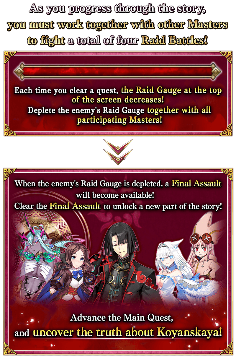 * If defeated in battle, you can use three Command Spells or one Saint Quartz to be revived and continue. * Once an enemy's Raid Gauge has reached zero, the battle will end and you will no longer be able to challenge that enemy. * It may take some time for the "Final Assault" to begin after an enemy's Raid Gauge has been reduced to zero.