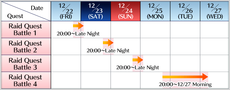 | Raid Quest Battle 1 | Beginning 2023-12-22 20:00 PST (GMT -8) |