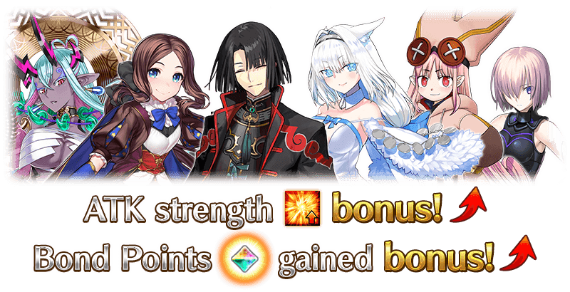 The Servants listed below will receive an "ATK Strength" bonus and a "Bond Points Gained" bonus during this event!
