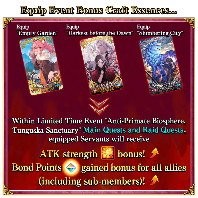 [Important] * Since there are no Free Quests in the Limited Event "Anti-Primate Biosphere, Tunguska Sanctuary", Limited Time Craft Essence event bonuses will only be available during Main Quests and Raid Quests within the event. Please note that after Raid Quests have ended, only Main Quests within the event will be eligible for these bonuses.