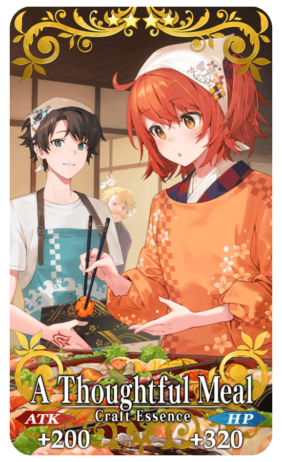 ★★★★SR A Thoughtful Meal ATK 200 (MAX: 750) HP 320 (MAX: 1200) Skill Restore 200 HP each turn & increase NP Strength by 15% for yourself |