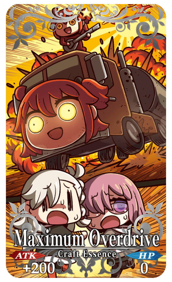 ★★★R Maximum Overdrive ATK 200 (MAX: 1000) HP 0 Skill Increase the amount of QP earned by 2024 when completing quests |