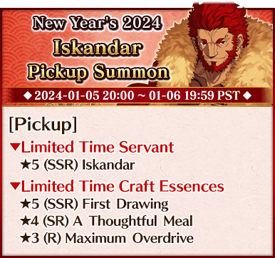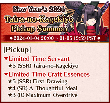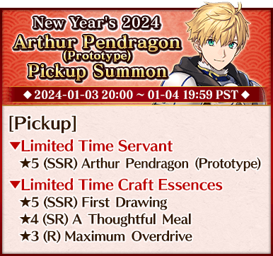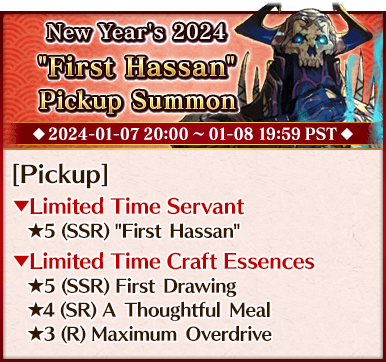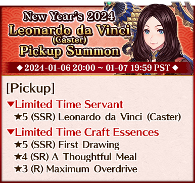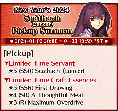 To celebrate the beginning of 2024, we're holding six Pickup Summons on a rotating schedule, each featuring a different Pickup Servant and three Limited Time Craft Essences!