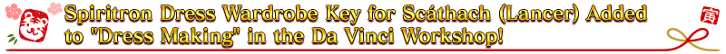 * The Spiritron Dress will change the appearance and some voice lines for "★5 (SSR) Scáthach (Lancer)". * Please note that although it is possible to obtain the Spiritron Dress Wardrobe Key even if you do not have "★5 (SSR) Scáthach (Lancer)", you cannot unlock the Spiritron Dress.