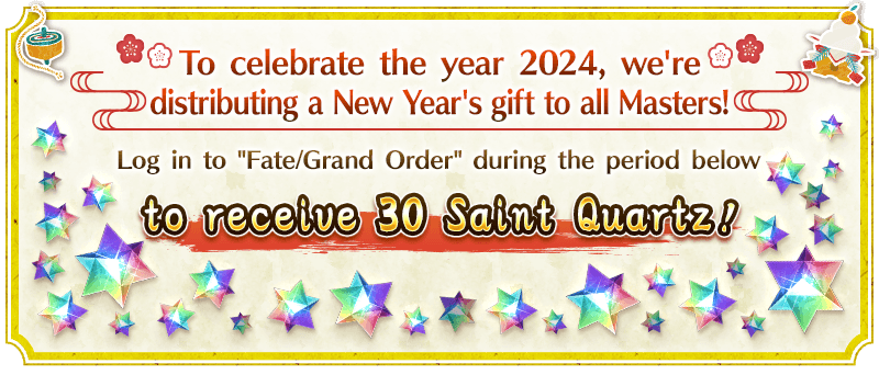 Log in for 14 days (once per day) during the period below to receive rewards including a total of 30 Saint Quartz (worth up to 11 Saint Quartz Summons) and other items to help strengthen your Servants!