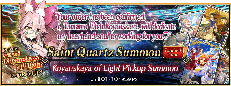 Limited Time Servant "★5 (SSR) Koyanskaya of Light" and three Limited Time Craft Essences from 2023’s "6th Anniversary Koyanskaya of Light Pickup Summon" will be available for Pickup until 2024-01-10 19:59 PST (GMT -8)!