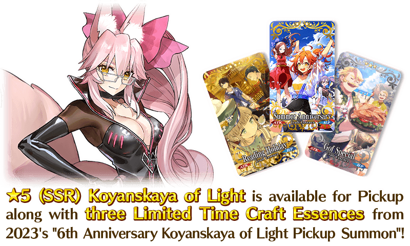 About Featured Servants: * The following Servant(s) will not be added to Story Summon after the Pickup Summon period ends. - ★5 (SSR) Koyanskaya of Light * Servants added to Story Summon through story progression will not be summonable. Please be sure to confirm the lineup before summoning. About Featured Servants: * The following are the only Limited Time Craft Essences available from this Pickup Summon. Please note that no other Limited Time Craft Essences will be available. - ★5 (SSR) Summer Anniversary - ★4 (SR) Reading Holiday - ★3 (R) Gof Special * The following Craft Essence(s) will also be available from Friend Point Summon for the duration of the Pickup Summon period. - ★3 (R) Gof Special * The following Craft Essence(s) will be automatically burned if you have ★3 (R) Craft Essences included in your Automatic Burning settings. Please check your settings before summoning. - ★3 (R) Gof Special