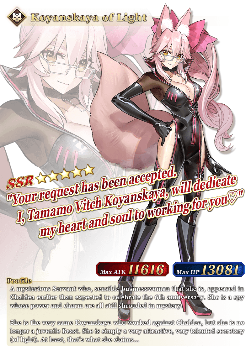 See "★5 (SSR) Koyanskaya of Light" in action on YouTube, where we're sharing an exclusive video of her Noble Phantasm!