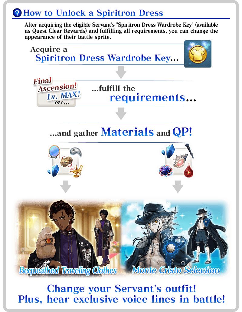 * The Spiritron Dress "Monte Cristo Selection" and the Spiritron Dress "Bequeathed Traveling Clothes" will change the appearance and some voice lines for "★5 (SSR) Edmond Dantès" and "★5 (SSR) Arjuna", respectively.