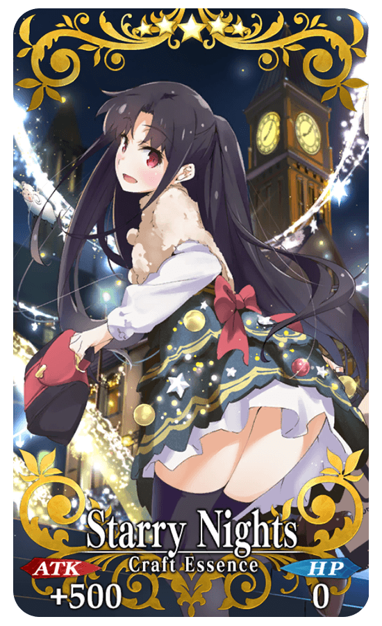 ★★★★★SSR Starry Nights ATK 500 (MAX: 2000) HP 0 Skill Increase Buster Card effectiveness by 10% & Critical Strength by 10% & begin battle with NP charged at 40% for yourself |