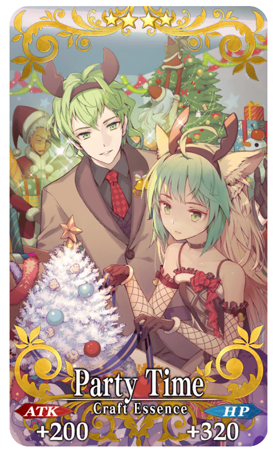 ★★★★SR Party Time ATK 200 (MAX: 750) HP 320 (MAX: 1200) Skill Increase Quick Card effectiveness by 8% & Buster Card effectiveness by 8% & Critical Strength by 5% for yourself |
