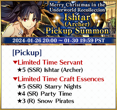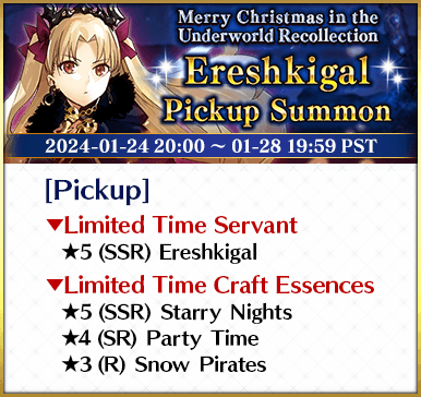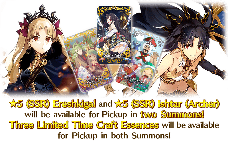 To celebrate "Main Interlude: Merry Christmas in the Underworld" becoming unlockable for free in "Exchange Rare Prisms" for Masters who have cleared Seventh Singularity, Limited Time Servants "★5 (SSR) Ereshkigal" and "★5 (SSR) Ishtar (Archer)" and three Limited Time Craft Essences from 2019's "Christmas 2019 Pickup Summon (Daily)" will be available for Pickup in two Pickup Summons!