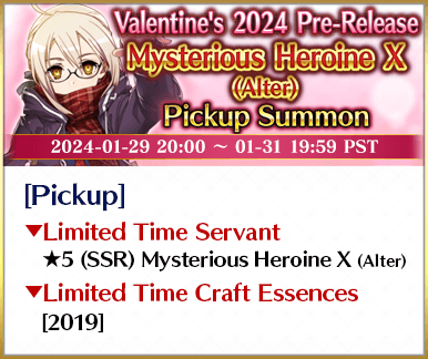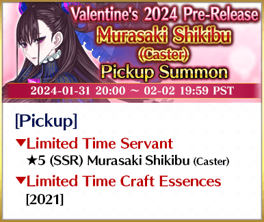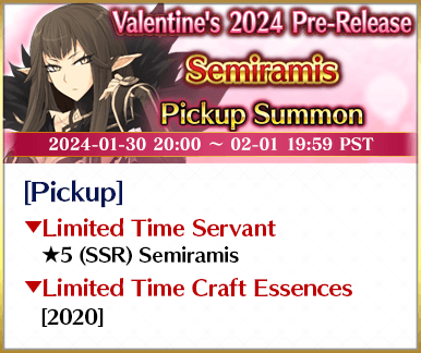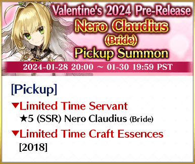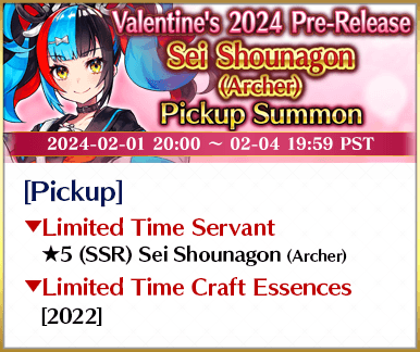In addition, the following 18 Limited Time Craft Essences from the 2018-2022 Limited Time Valentine's Events will be available for Pickup in their specific five summons as part of "Valentine's Day Pre-Release 2024 Pickup Summon."