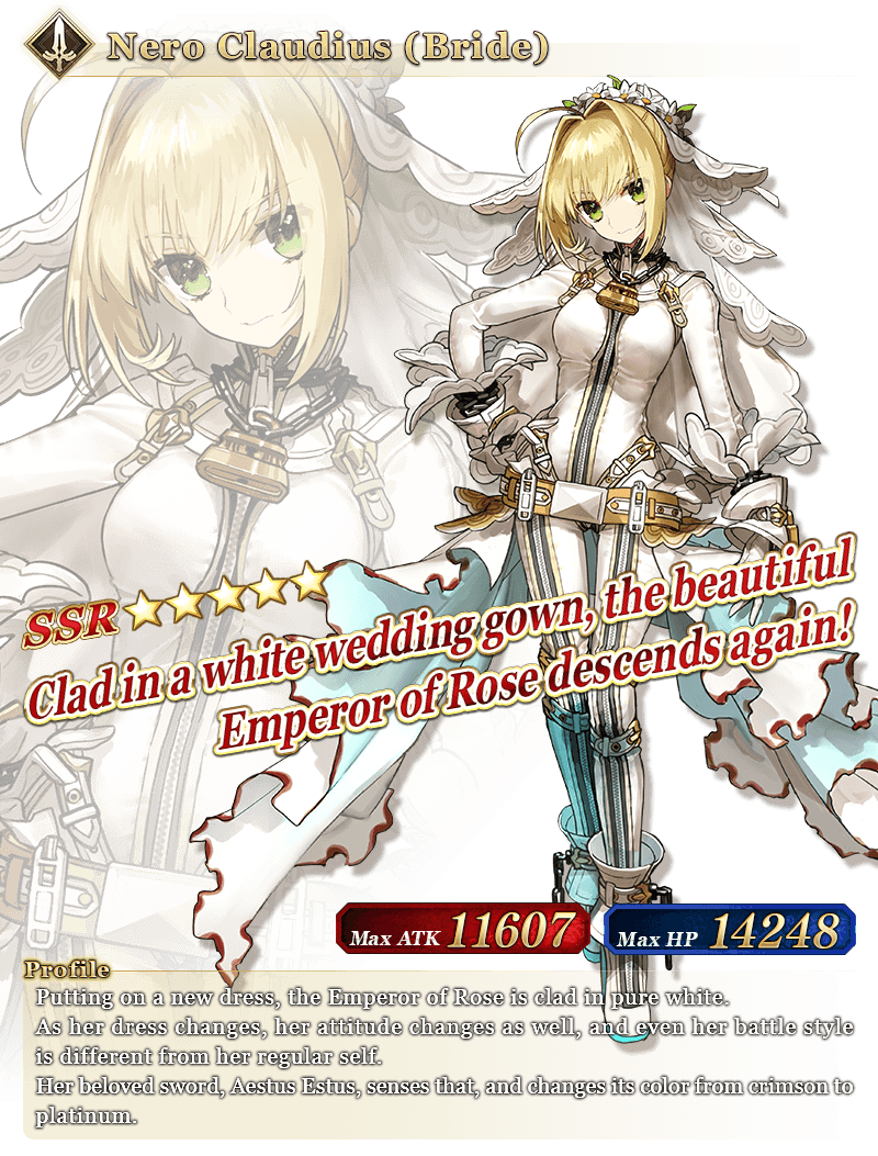 First Valentine's ATK 200 (MAX: 750) HP 320 (MAX: 1200) Skill Increase Quick Card & Buster Card effectiveness by 8% & NP Strength by 5% for yourself |