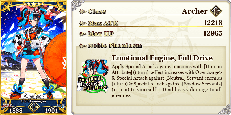 Pharaoh Xocolatl ATK 500 (MAX: 2000) HP 0 Skill Increase Buster Card effectiveness by 10% & NP Strength by 10% & NP Gain by 15% for yourself |