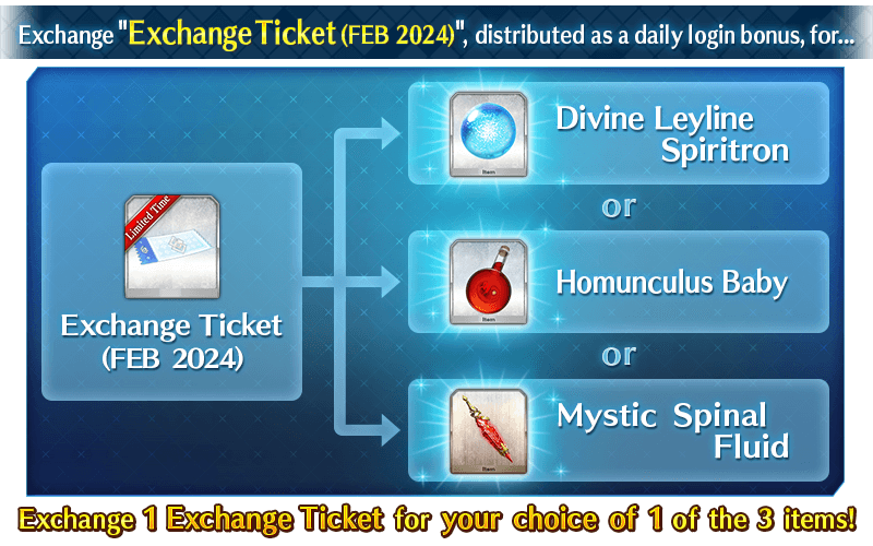 The "Exchange Ticket (FEB 2024)" distributed as a daily login bonus will be exchangeable for the following items.