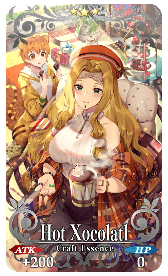 ★★★R Hot Xocolatl ATK 200 (MAX: 1000) HP 0 Skill Increase Buster Card effectiveness by 3% & HP Recovery amount by 5% for yourself + Increase Cacao Chips amount per drop by 1 [Event Only]