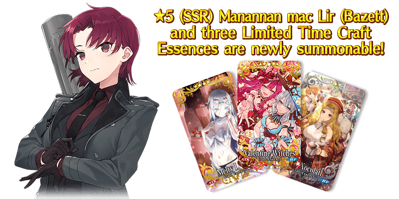 To commemorate the Limited Time Event "Manannan's Souvenir Valentines: The Chocolate Tree and the Goddess's Choice", new Limited Time Servant "★5 (SSR) Manannan mac Lir (Bazett)" and three Limited Time Craft Essences will be featured as a Pickup Servant and Pickup Craft Essences!