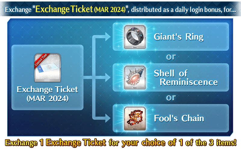 The "Exchange Ticket (MAR 2024)" distributed as a daily login bonus will be exchangeable for the following items.