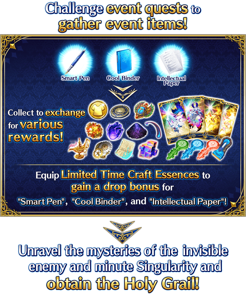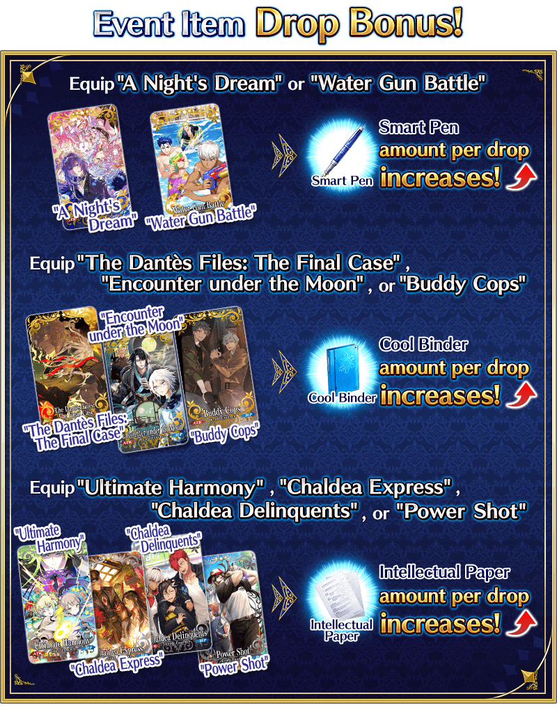 Servants equipped with the Limited Time Craft Essences "★5 (SSR) A Night's Dream", "★5 (SSR) Water Gun Battle", "★4 (SR) The Dantès Files: The Final Case", "★4 (SR) Encounter under the Moon", "★4 (SR) Buddy Cops", "★3 (R) Ultimate Harmony", "★3 (R) Chaldea Express", "★3 (R) Chaldea Delinquents", and "★3 (R) Power Shot", available through the ongoing Pickup Summons, will receive a bonus to the amount per drop of event items "Smart Pen", "Cool Binder", and "Intellectual Paper".