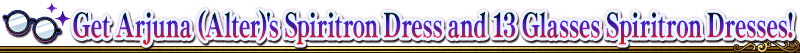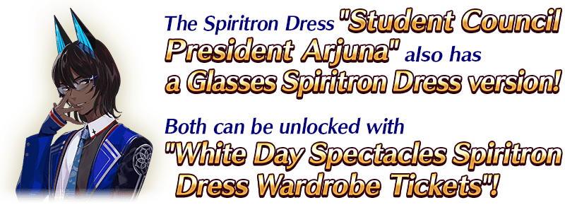 The new Spiritron Dresses include the Spiritron Dress "Student Council President Arjuna" for "★5 (SSR) Arjuna (Alter)", and 13 Glasses Spiritron Dresses for Servants who appear in the story of this event. Each Spiritron Dress can be unlocked using a "White Day Spectacles Spiritron Dress Wardrobe Ticket".