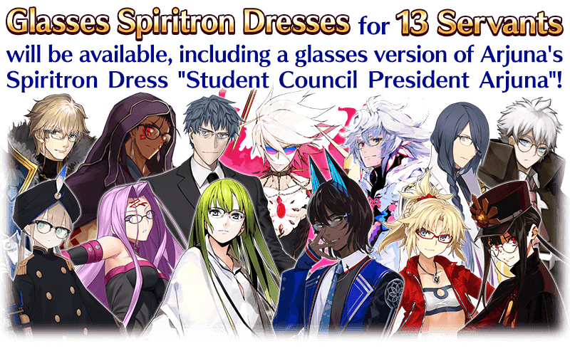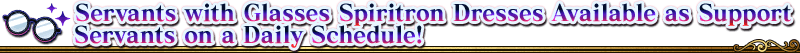 The 13 Servants with Glasses Spiritron Dresses will be available as Support Servants for Free Quests within Limited Time Event "15 Bespectacled Intellectuals" on a rotating daily schedule!