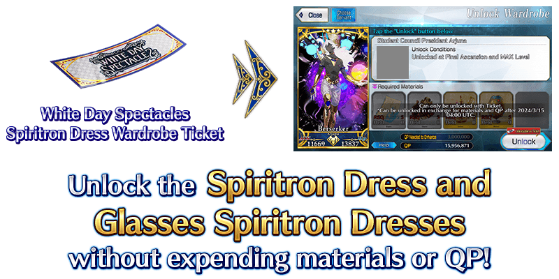 * After the event period ends (after 2024-03-14 21:00 PDT (GMT -7)), you can choose to use either "White Day Spectacles Spiritron Dress Wardrobe Tickets", or other materials and QP, as done normally with other Spiritron Dresses, to unlock the Spiritron Dress Wardrobe Keys obtained in this event.