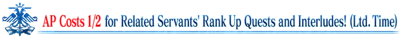 * All Interludes of the above Servants are included in this campaign (including in the case of Servants who have multiple Interludes). * In the event that you meet the requirements and clear an Interlude of a Servant who you do not yet own during the campaign period, the Rank Up rewards provided as clear rewards will be applied to that Servant should you obtain them in the future. * The completion of Servant Interludes will still count towards your Extra Mission progress even if you do not own the related Servant. * All Interludes that are part of this campaign, if not cleared during the campaign period, will no longer be available to Masters who do not own the Servant in question and will return to their normal unlock conditions after the campaign period ends. * You cannot re-challenge Servant Interludes you have already cleared.