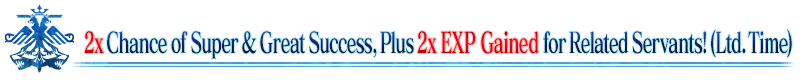 During the campaign period, when Enhancing Servants related to Part 2 Chapter 1 "Lostbelt No.1: Permafrost Empire, Anastasia - The Grand Duchess of the Beast Nation", the chance of Super Success (double EXP) and Great Success (triple EXP) will be doubled! Plus, the eligible Servants will gain double EXP!