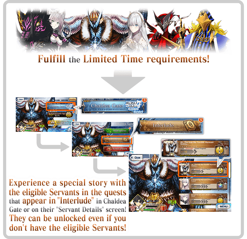 * All Interludes of the above Servants are included in this campaign (including in the case of Servants who have multiple Interludes). * In the event that you meet the requirements and clear an Interlude of a Servant who you do not yet own during the campaign period, the Rank Up rewards provided as clear rewards will be applied to that Servant should you obtain them in the future. * The completion of Servant Interludes will still count towards your Extra Mission progress even if you do not own the related Servant. * All Interludes that are part of this campaign, if not cleared during the campaign period, will no longer be available to Masters who do not own the Servant in question and will return to their normal unlock conditions after the campaign period ends. * You cannot re-challenge Servant Interludes you have already cleared.