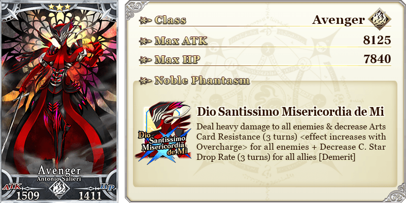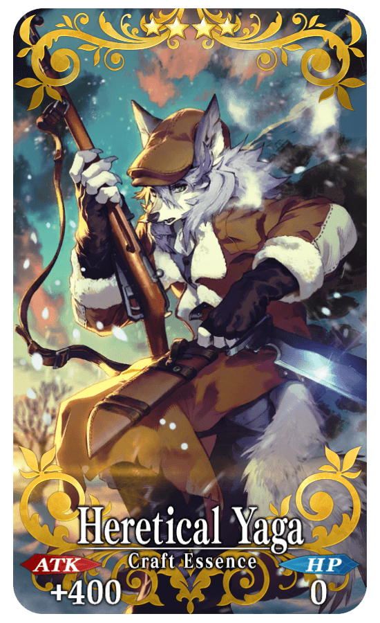 ★★★★SR Heretical Yaga ATK 400 (MAX: 1500) HP 0 Skill Increase Buster Card effectiveness by 8% & increase Critical Strength by 10% & increase C. Star Drop Rate by 10% for yourself |