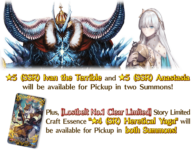 * Within this summon, Story Limited Craft Essence "★4 (SR) Heretical Yaga" will only be available for Pickup for Masters that have cleared Part 2 Chapter 1 "Lostbelt No.1: Permafrost Empire, Anastasia - The Grand Duchess of the Beast Nation".