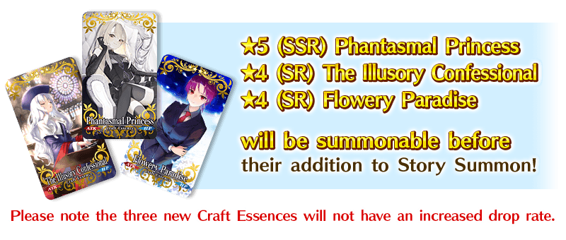* Because of the addition of the Craft Essence "★4 (SR) Heretical Yaga" to this summon, the drop rates of other individual ★4 (SR) Craft Essences will be different than usual. However, the overall drop rate of ★4 (SR) Craft Essences has not changed, and the drop rate of new Craft Essences "★4 (SR) The Illusory Confessional" and "★4 (SR) Flowery Paradise" will not change.