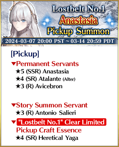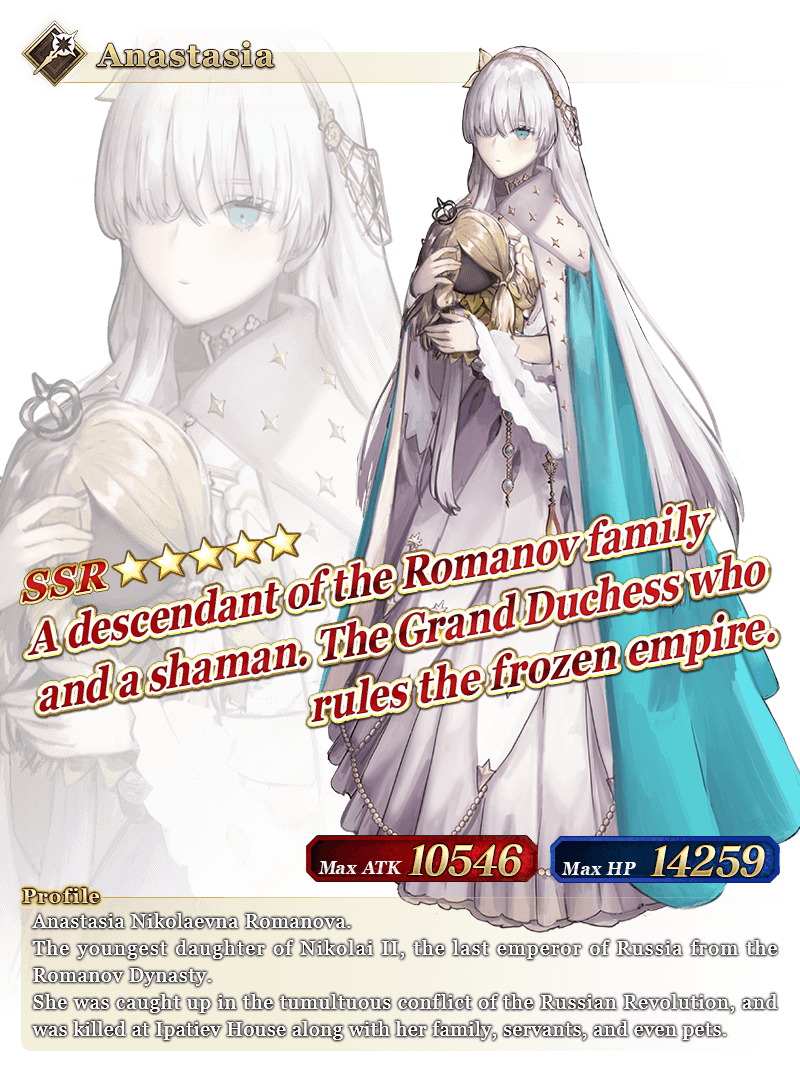 Masters who have not cleared Part 2 Chapter 1 "Lostbelt No.1: Permafrost Empire, Anastasia - The Grand Duchess of the Beast Nation" will not be able to summon the Craft Essence as part of this summon.