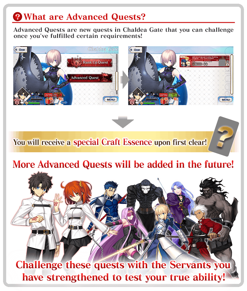 Advanced Quests are quests you can challenge multiple times once they have been unlocked. Upon first clear, you will earn a special Craft Essence.