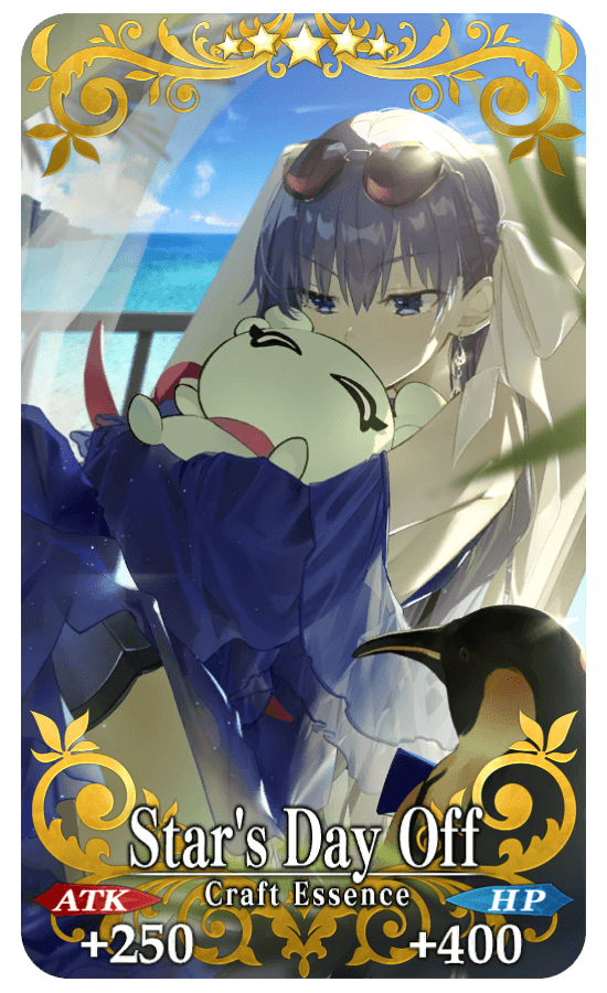 ★★★★★SSR Star's Day Off ATK 250 (MAX: 1000) HP 400 (MAX: 1600) Skill Increase Quick Card effectiveness by 8% & Arts Card effectiveness by 8% & NP Strength by 5% & begin battle with NP charged at 30% for yourself + Increase amount of Energetic Con, Cheerful Con, and Laudable Con per drop by 1 [Event Only]